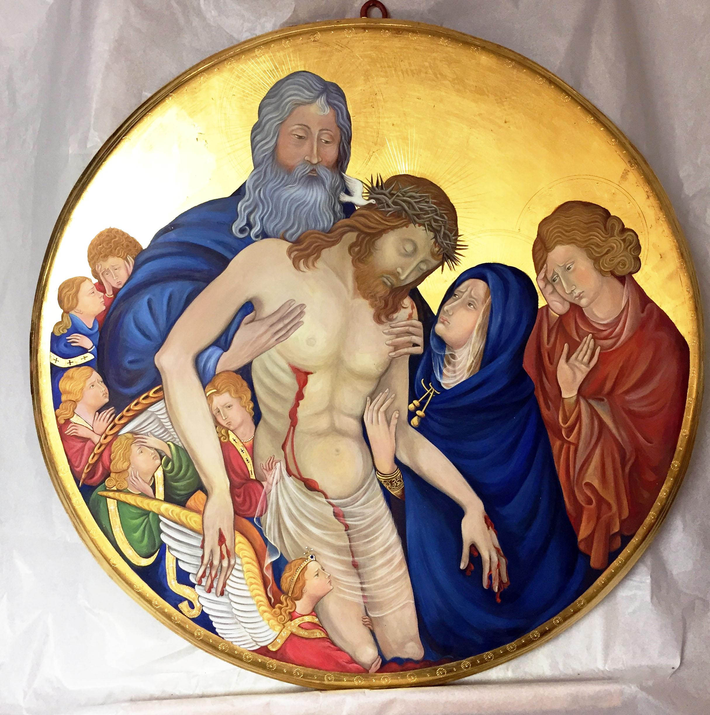 History: Jean Malouel in Dutch Jan Maelwael (Gueldre, 1397 -1415), Dutch painter and miniaturist. He was court painter to Queen Isabella of Bavaria and the Duke of Burgundy and an important artist of the international Gothic. Jean Malouel's original painting is kept in the Louvre in Paris. Jean Malouel paints a Grande Pietà Ronde - Pitié de Notre Seigneur (1400-1415), where pain becomes intimate, more composed, silent, combined with a great linear refinement. The work was commissioned by Philip the Ardito, brother of King Charles V. This beautiful work, particularly dense with devotion, was created by Silvia Salvadori on commission. Its realization involved many months of work and study. In particular, the original colors have been restored, largely greatly altered by aggressive cleaning carried out over the centuries both on the paint film and in the gilding. In some parts of the original painting the decoration had disappeared and therefore a careful and complete reconstruction was necessary. Silvia Salvadori has added a thin gilded and finely engraved band to replace a hypothetical frame once present in the original work. The best pigments used and described by the most important Tuscan master painters, first of all Cennino Cennini, were used for this work. Everything has been taken care of in every little detail, from the hair, to the wings of the angels, to the gaudy draperies, up to the expressions of the faces very similar, if not identical to the original work.