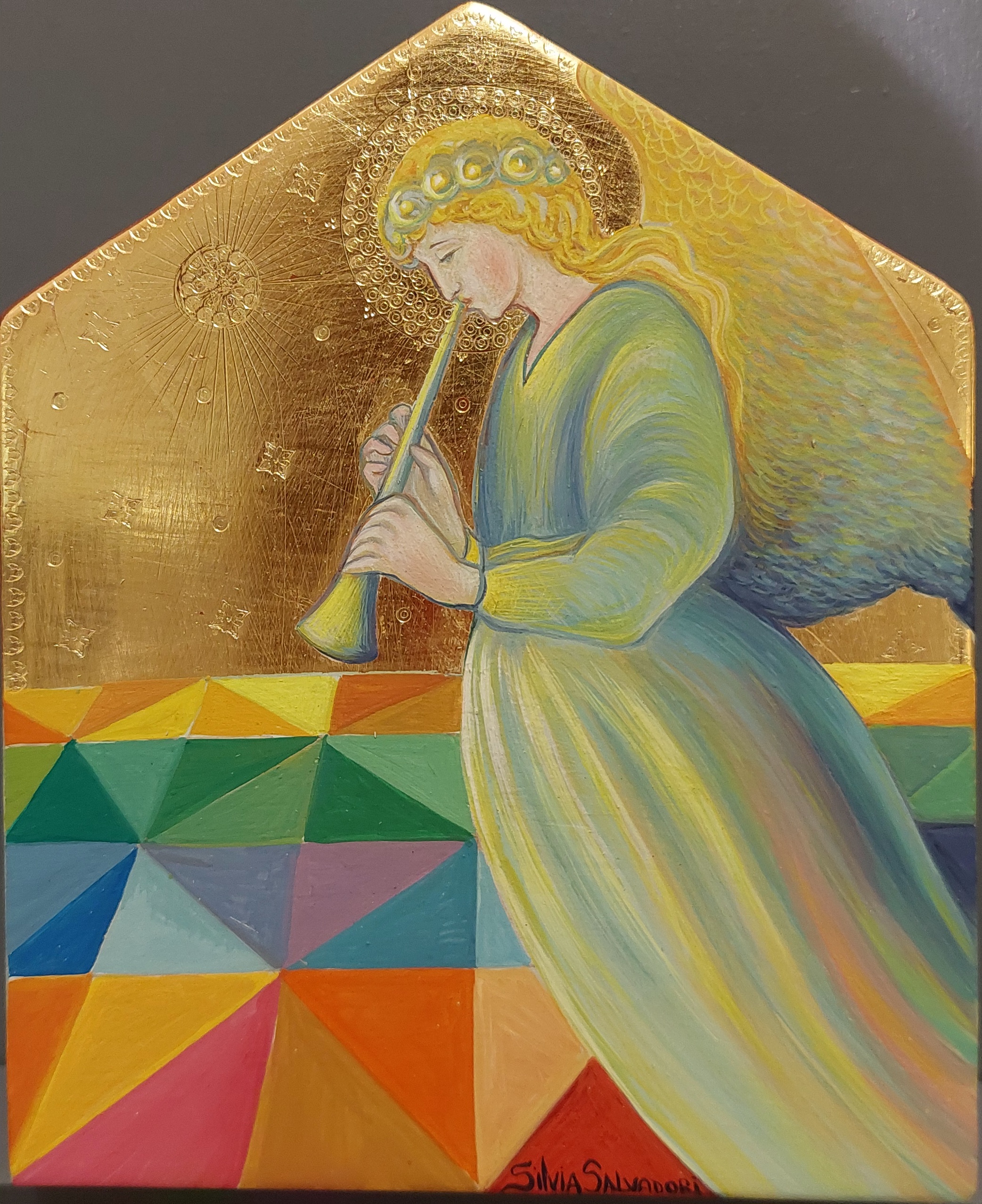 Musician angel on pure gold ground engraved with burin. Antique poplar board. 23-karat pure gold. Pure pigments Painting housed in Sandro Botticelli. Original technique of the Sienese school.