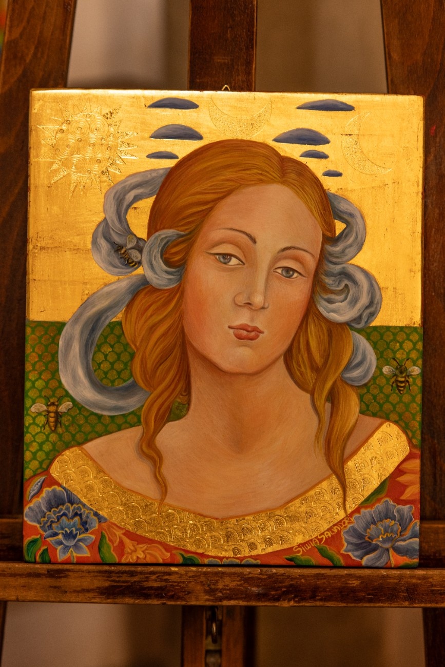 Tempera on 23 ¾ karati pure gold ground engraved with burin, poplar board. Painting technique of the Tuscan school of the early Renaissance on a gold ground. Pure pigments taken from ancient medieval painting recipes in Tuscany. Selene, Goddess of the Moon becomes a Venus Botticelli that recalls the painting style of Sandro Botticelli. As in a new Renaissance Spring, Selene wears a precious cobalt blue and orange floral dress. The dress is embellished with a finely engraved pure gold choker band. Selene becomes a queen dominating nature and the bees symbolizing eternity that surround and protect her. The colors used by Silvia Salvadori are pure and precious. The emerald green in the background becomes a meadow guardian of the hive. The silk ribbons that wrap the Goddess' golden hair are caressed by the wind. The clouds above the Goddess' head recall the clouds of the Madonna in Masolino da Panicale's "Miracle of the Snow." Each element in this work becomes a master archetype and guardian of ancient and profound messages. All of Botticelli's style lives again in a painting of extraordinary contemporaneity