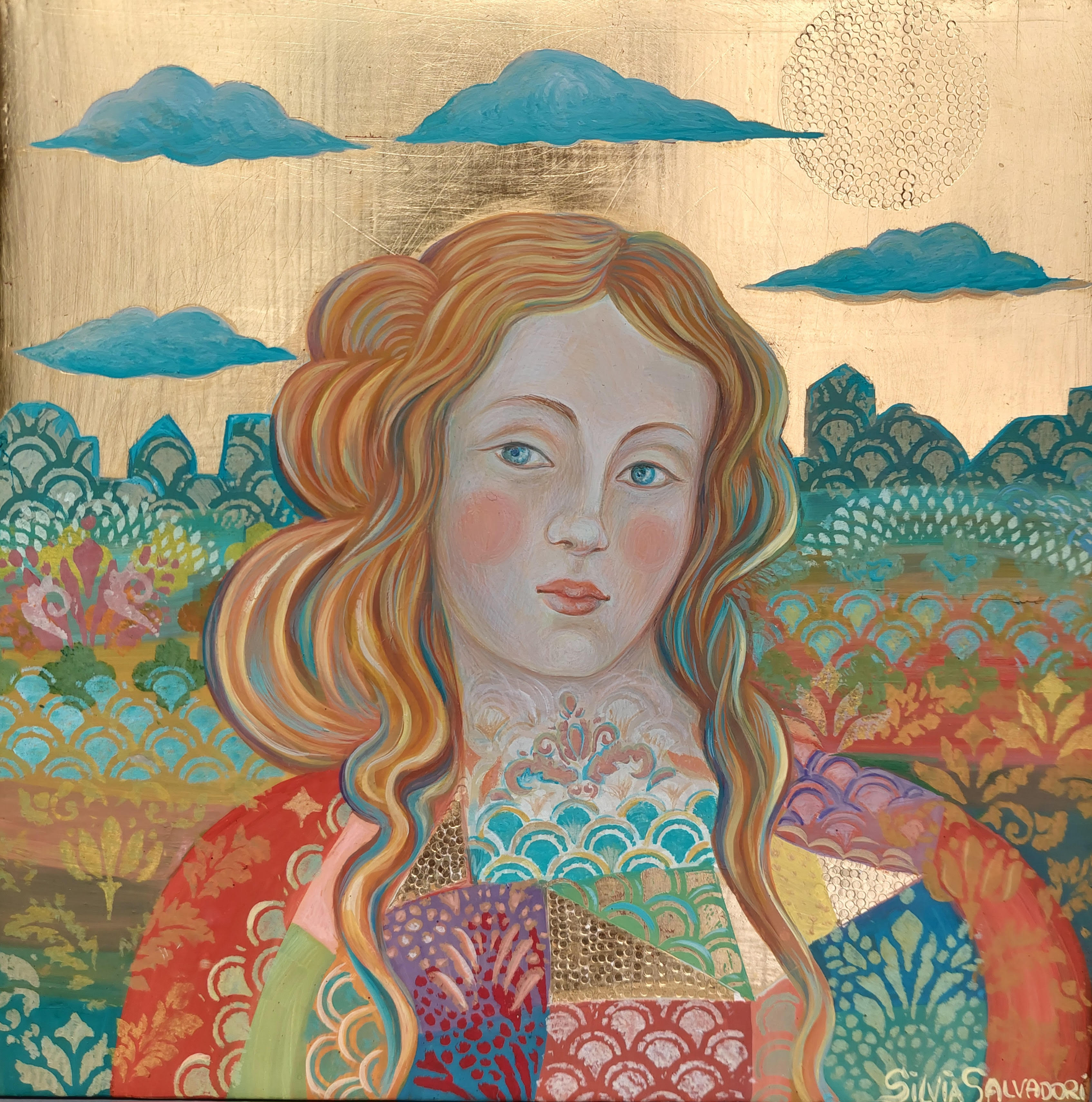 Renaissance Geometries Series Tempera on pure gold ground 23 ¾ K. Painting by Silvia Salvadori executed with the ancient painting technique of the Tuscan school of the early Renaissance. Engraved on pure gold with burin. Antique poplar wood panel. The young woman with long golden hair recalls Botticelli's painting. The dress is composed of fragments of fabric that recall ancient decorations found in Florentine Renaissance Madonnas. Pure gold embellishes the sumptuous brocade robe. The Tuscan Renaissance is revived in a modern key in each work by Silvia Salvadori. The Tuscan landscape in the background blends perfectly into the composition and the naturalistic elements themselves have been painted using ancient pigments from Cennino Cennini's palette.