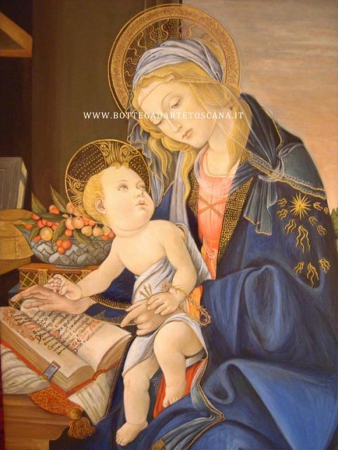 In these works by Silvia Salvadori, we highlight the desire to deepen the painting of all the Tuscan Early Renaissance. In particular she carries out careful studies of the style of great master Sandro Botticelli. This work is distinguished by elegance and great mastery of execution. The work was commissioned to teacher Silvia Salvadori, and she needed a lot of work, since this item is not only large but also rich in details. First of all the bulky drapery of the blue dress from whose shoulder falls a delicate white veil, made by Silvia teacher, translucent and transparent. Extreme care and accuracy are noted in the fruit basket, in the biscuit casket and the book. There are many golden glories on Mary's hair, on the fabrics, on the leaves in the fruit basket, and on the goldfish horns. Silvia Salvadori paints Virgin's face to perfection and performs an elegant miniature decor inside it. Same precision of brushstroke we can notice on hair, even more emphasized by a thin line of pure gold. The pigments are the same as those used by Sandro Botticelli. History: The original table of The Virgin and Child (The Madonna of the Book) is preserved at the Poldi Pezzoli Museum in Milan. The Virgin Mary and the book is a tempered painting on the table (58x39,5 cm) by Sandro Botticelli, dating back to 1480-1481.