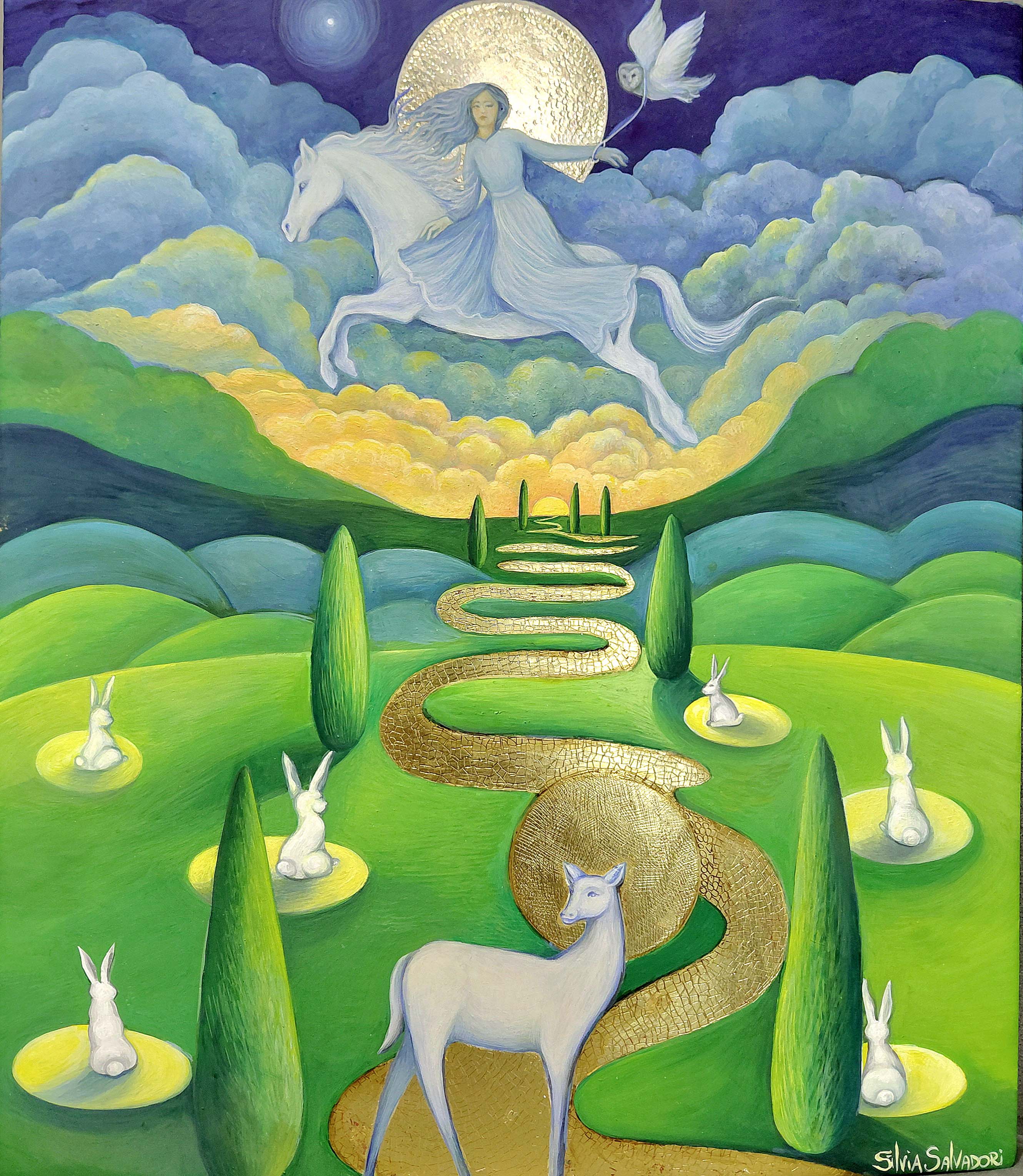 Dipinto di Silvia Salvadori. "La Cerva bianca" Tempera su fondo oro zecchino 24 carati e argento inciso a bulino su tavola. Tecnica originale della scuola senese del primo rinascimento.
