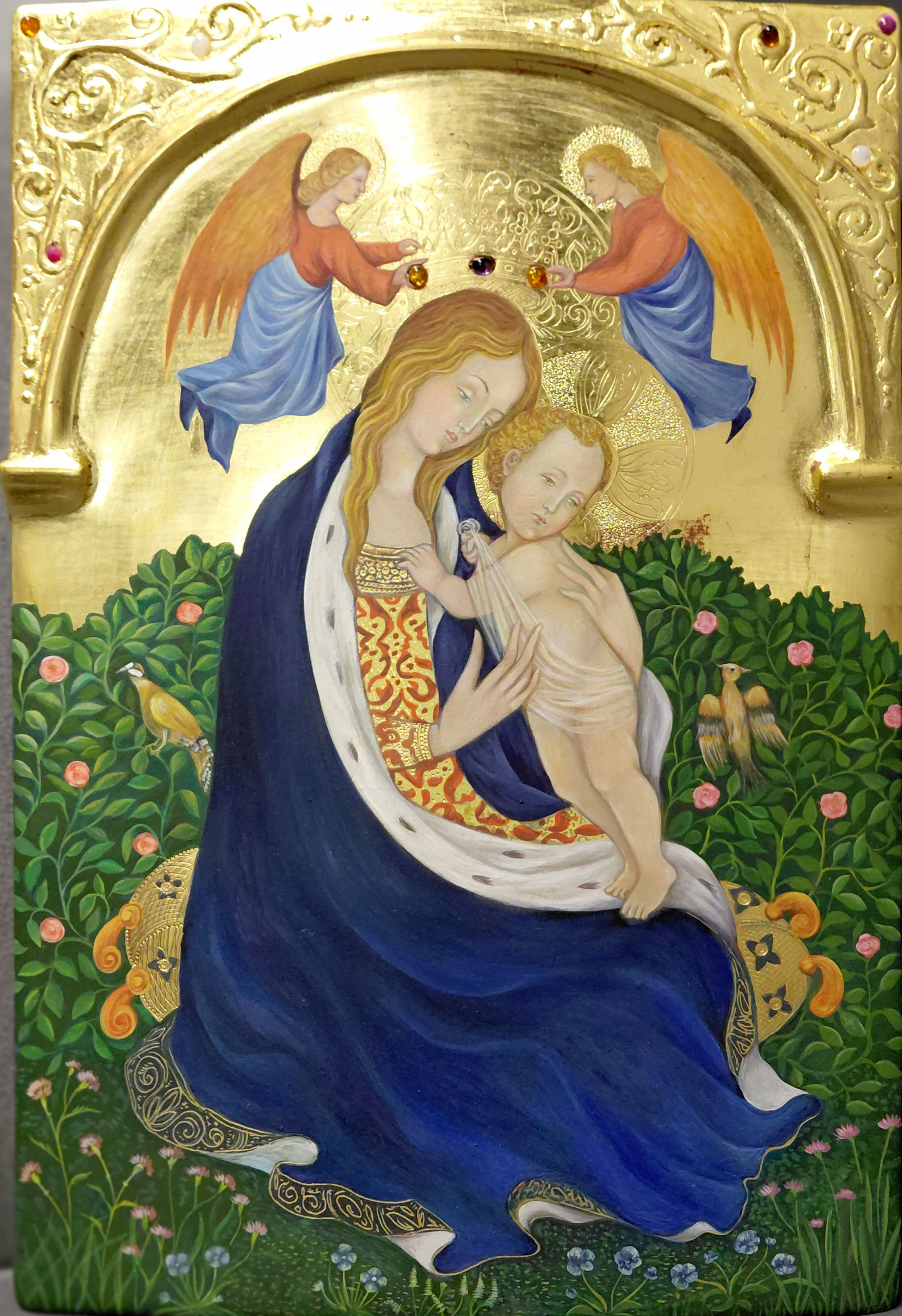 Madonna con Bambino. Reinterpretazione della Madonna dell'Umiltà di Gentile da Fabriano. Tempera e oro zecchino 24 carati su tavola. Dipinto di Silvia Salvadori. Tempera su fondo oro zecchino, pietre preziose, tavola antica. Decorazioni eseguite con la tecnica della pastiglia su oro zecchino e a cesello. Raffigurazione della Madonna dell'umiltà in stile rinascimentale eseguita con le stesse tecniche pittoriche della scuola del primo rinascimento toscano. Pigmenti Cennino Cennini. Oro zecchino 24 carati finemente inciso a bulino. Doratura a guazzo. Tecnica originale scuola senese. Dipinto a mano di Silvia Salvadori