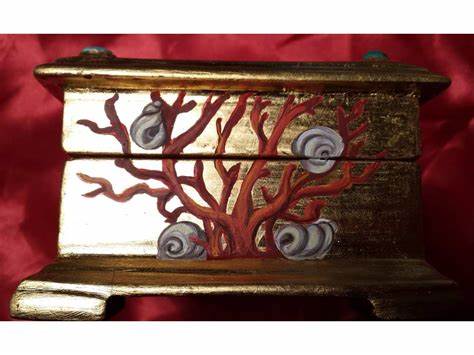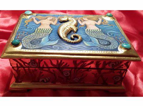 Scrigno medievale in oro zecchino, pietre dure (turchesi), dipinto a tempera e raffigurante due sirene con al centro un cavalluccio marino dorato in rilievo. Tutti i lati dello scrigno presentano coralli e chiocciole di mare dipinte. Dipinto autografo di Silvia Salvadori.